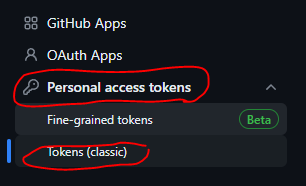 좌측 하단 Personal access tokens -> Tokens (classic)