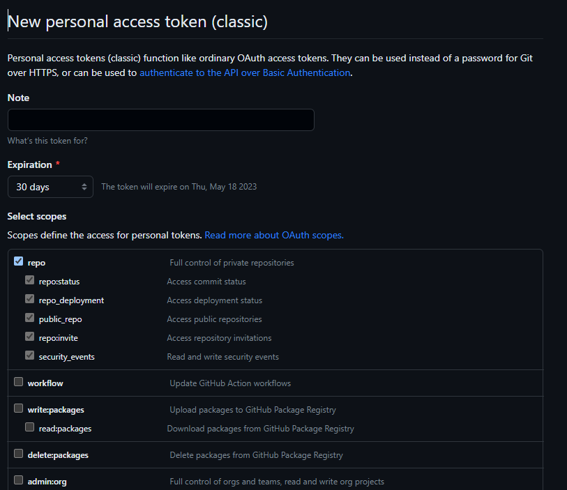 우측 상단 Generate new token -> Generate new token (classic)